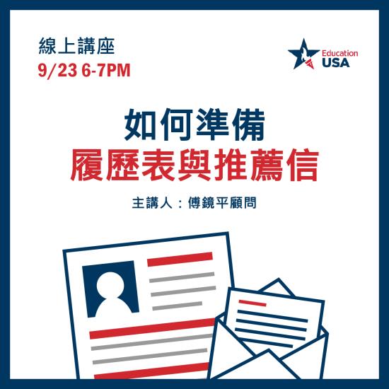 申請美國留學時,在需要準備的申請資料中履歷表及推薦信都很常見,它們能讓審查者在最短的時間內了解一個申請者,那要怎麼要準備一份完美的履歷表及推薦信才能在短短時間內從眾多競爭者中脫穎而出,進而獲得青睞呢?歡迎有興趣的同學報名參加此講座!