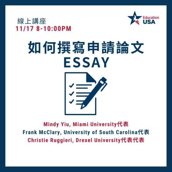 高中生在申請美國大學時,申請論文(essay)是相當重要的申請文件,尤其在疫情期間,很多學校不要求SAT或ACT分數,更加重申請論文的重要性。我們邀請到三所美國大學的代表來介紹如何撰寫申請論文,同時也會介紹俄亥俄、賓州及南卡羅來納的留學環境, 歡迎有興趣的高中生及家長參加。