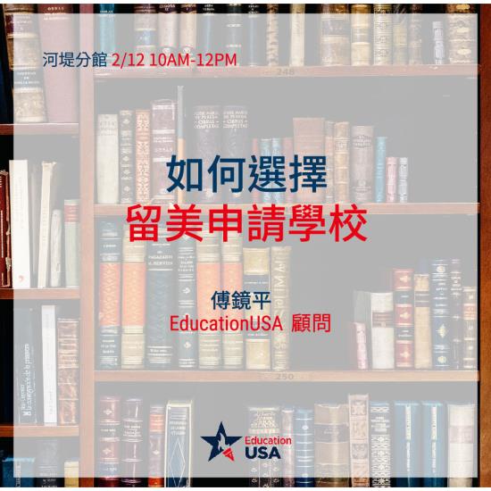 美國有超過4千所大學,如何在眾多的大學及科系當中選擇適合自己的課程確實不容易,本中心資深教育顧問傅鏡平先生將為聽眾分析在選擇申請學校過程中需要考慮的各種因素,而且也會介紹申請大學部、碩士班及博士班在選擇上的差異之處,歡迎南部的朋友踴躍參加! 活動完全免費,報名請洽07-341 2537。 時間:2月12日(六) 10am-12pm 地址:高雄市立圖書館河堤分館3樓 (高雄市三民區裕誠路1號) 電話: 07-341 2537 講座日期: