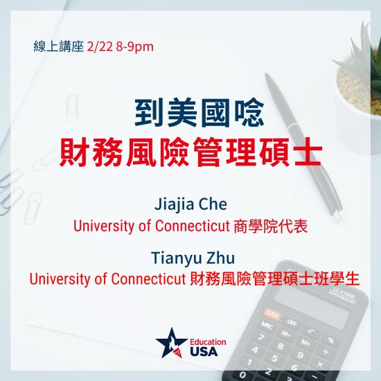 您想要到美國唸財務風險管理碩士嗎? 我們邀請到University of Connecticut商學院的代表Jiajia Chen來為台灣同學介紹美國財務風險管理碩士的課程內容以及申請方式,同時也會有一位目前正在就讀財務風險管理的碩士生Tianyu Zhu分享他就讀碩士班以及擔任學生基金經理人的經驗, 歡迎有興趣的朋友參加(本講座以中文進行)。