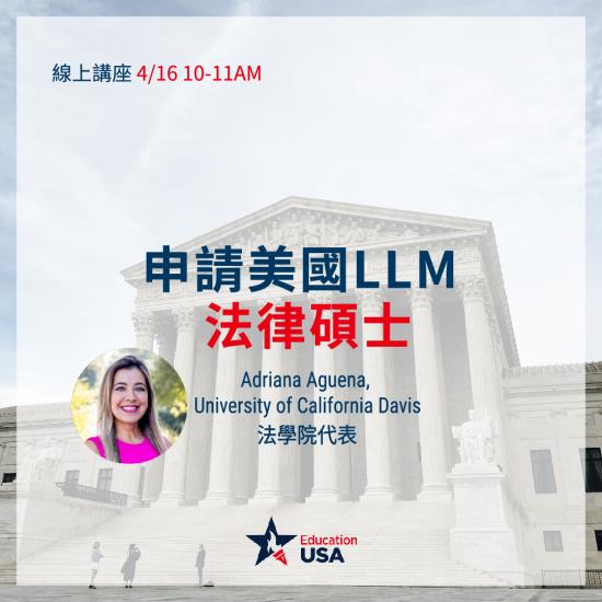 你想申請美國的LLM法律碩士嗎? 歡迎參加由University of California Davis法學院代表Adriana Aguena主講的線上講座,講者本身即獲有LLM學位,可以解答關於申請及就讀LLM學位的各種問題。