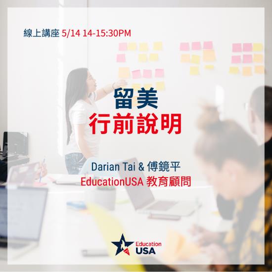 別急別急,EducationUSA與台北市立圖書館即將舉辦今年度的留美行前說明會,兩位EducationUSA教育顧問Darian Tai及傅鏡平將會分享留學美國的各種tips、解答大家的疑難雜症。還在等什麼?趕快呼喚你即將留美的小夥伴一起來參加吧!