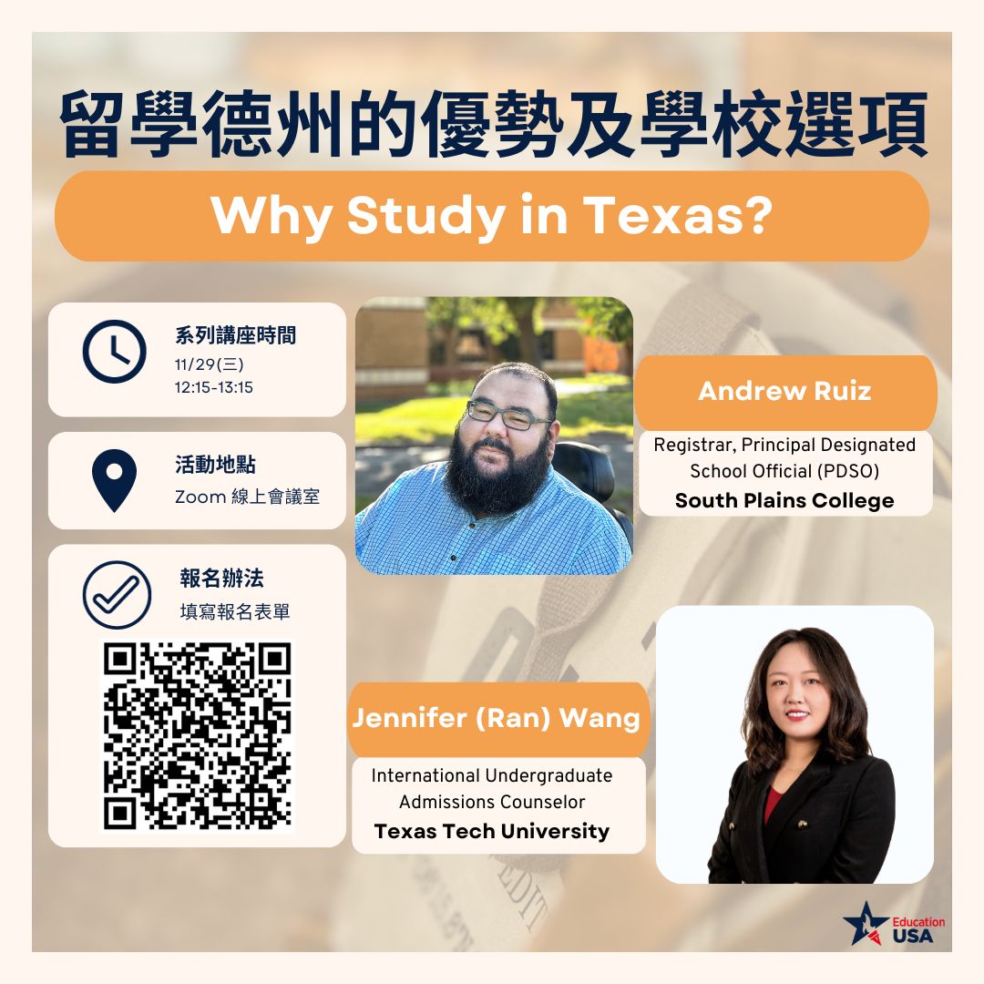 Andrew Rulz 和 Jennifer Wang 將為你介紹留學德州的優勢和各種學校選項。無論是對德州生活學術環境 還是招生程序有興趣,都歡迎報名參加!