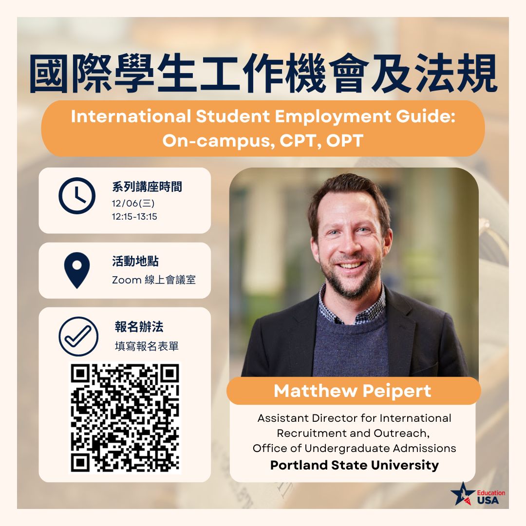 • 講者:Matthew Peipert (波特蘭州立大學 Portland State University 招生辦公室國際招生和外展助理主管)