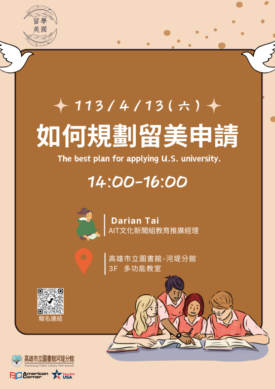 課程大綱: 美國各大學學制 如何評估適合我的學校? 目前國際學生留學趨勢,留美大學和研究所比較熱門的領域是哪些? 留美獎學金和工作機會介紹 美時程該如何規劃,需要著手那些事項 留美考試應如何準備,有哪些考試應該準備 所有申請文件應注意事項解析和提醒 活動詳情: 講師:Darian Tai(AIT文化新聞組教育推廣經理) 活動語言:中文 活動時間:4月13日(星期六)14時至16時 活動地點:高雄市立圖書館河堤分館-3樓多功能教室 馬上報名:點我報名