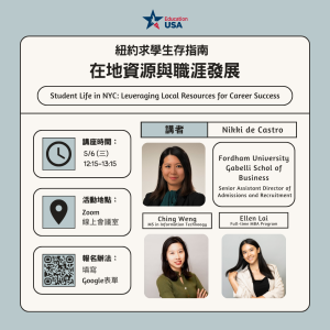 活動介紹:在充滿機遇與挑戰的紐約市(New York City)求學,如何有效利用在地資源來提升個人職場競爭力?本次 EducationUSA Brown Bag Series 邀請到福坦莫大學 (Fordham University) Gabelli 商學院的招生官 Nikki de Castro,以及兩位分別就讀於 MBA 與資訊技術(Information Technology)碩士學位的校友,與大家分享在「大蘋果」紐約求學的生存實錄。講座將從學生視角探討如何鎖定紐約在地的實習機會與職涯資源,協助有志前往紐約發展的學子做好萬全準備。