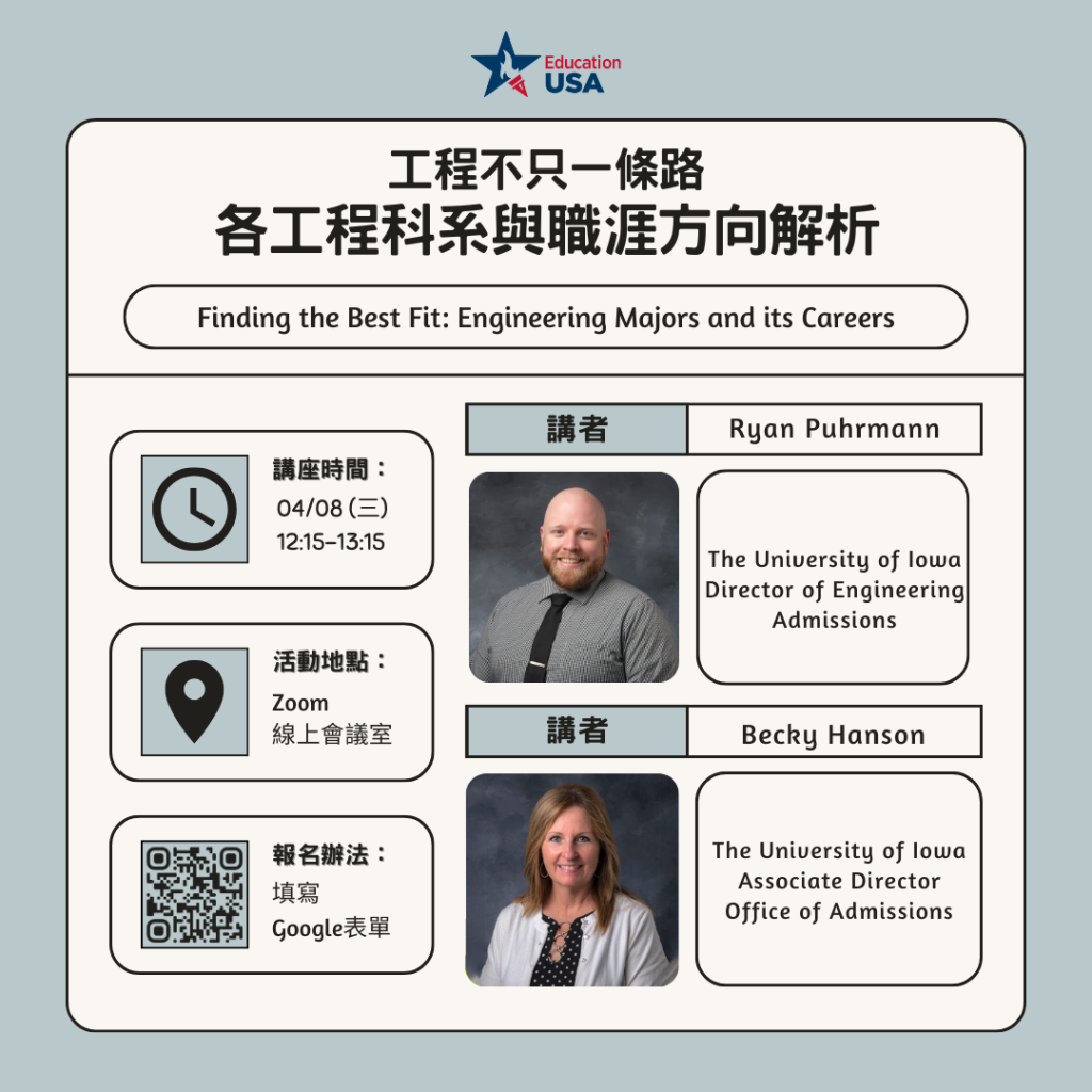 Posted by Chelsie Kuan 1 min read 2026/4/11 (六) [線上講座] 美國研究所及大學申請流程與材料工程博士班申請經驗分享 講座活動 Posted by Chelsie Kuan 1 min read 2026/4/8 (三) [線上講座] 工程不只一條路:各工程科系與職涯方向解析 講座活動 Posted by Chelsie Kuan 1 min read 2026/3/25 (三) [線上講座] 如何善用 AI 協助留學:從選校、申請到學術誠信 講座活動 Posted by Chelsie Kuan 1 min read 2026/3/21 (六) [線上講座] 出國,真的只是換地方住嗎?關於選擇、學習與多走一步的人生 講座活動 Posted by Chelsie Kuan 1 min read 2026/3/20 (五) & 3/27 (五) [線上講座] 賓州 Marywood University 國際學生線上說明會 講座活動 Posted by Chelsie Kuan 1 min read 2026/3/11 (三) [線上講座] 國際學生獎學金與各類資助:招生官深度對談 講座活動 Posted by Chelsie Kuan 1 min read 2026/3/6 (五) [線上講座] 傅爾布萊特教師教案研究獎助:得獎學人經驗分享 講座活動 Posted by Chelsie Kuan 1 min read 2026/2/25 (三) [線上講座] 美國商學研究所攻略:MBA/MS 申請技巧、獎學金與職涯展望 講座活動 Posted by Chelsie Kuan 1 min read 2026/2/11 (三) [線上講座] 美國藝術學校以及就業資源介紹 講座活動 123